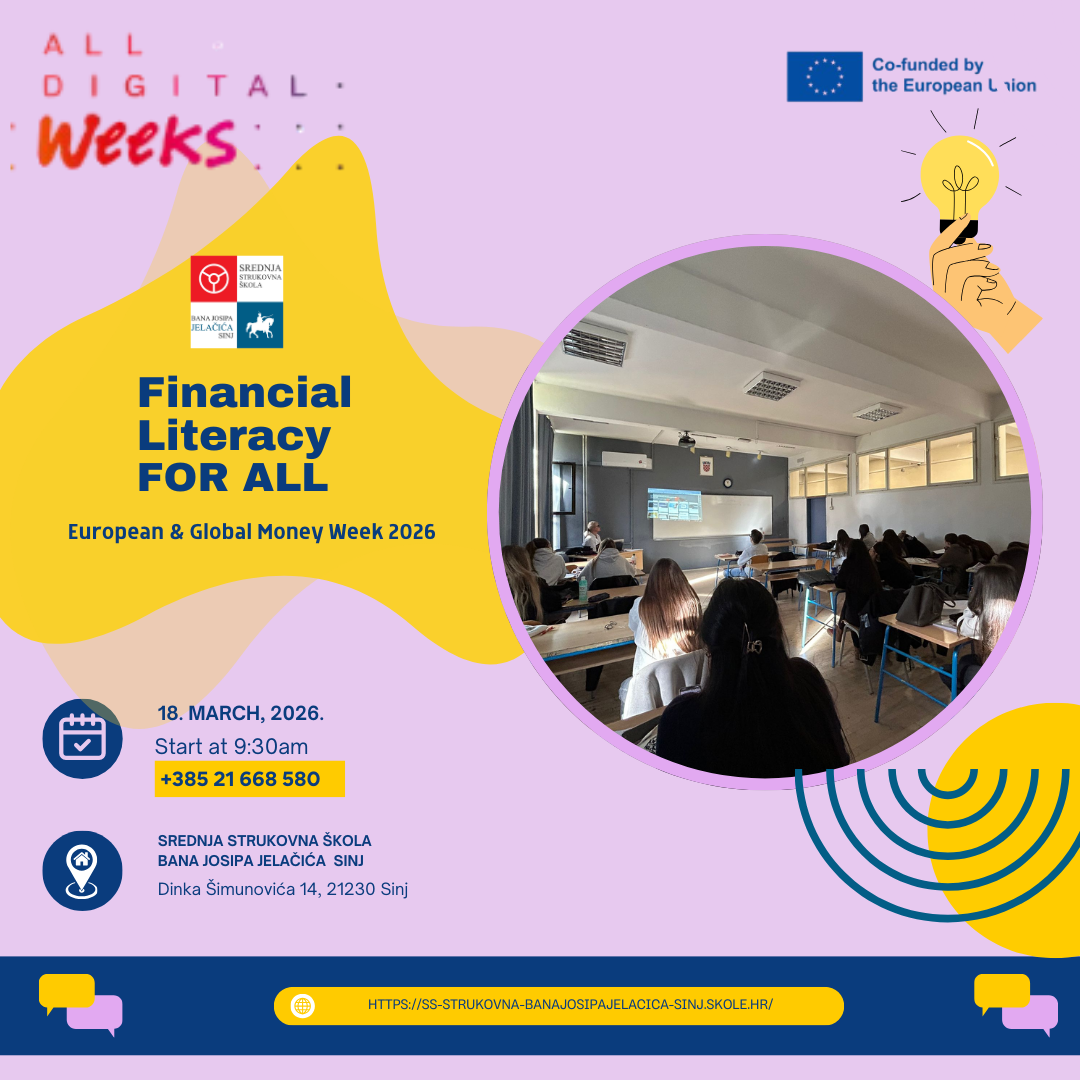 Financial Literacy for All is an educational workshop organized as part of the All Digital Weeks 2026 campaign and European & Global Money Week 2026.The event aims to strengthen financial awareness and improve digital and financial competences among students. Through interactive presentations, practical examples, and group discussions, participants will develop essential skills needed for responsible financial behaviour in everyday life. The workshop focuses on understanding budgeting, saving, responsible spending, and making informed financial decisions. Participants will enhance their financial decision-making skills by learning how to plan and manage personal finances effectively. They will develop critical thinking skills to evaluate financial opportunities and risks, as well as digital financial literacy by using modern tools such as online banking and digital payment systems safely and responsibly. The event also promotes an entrepreneurial mindset, encouraging students to recognize opportunities and understand basic economic principles. In addition, participants will strengthen problem-solving, communication, and collaboration skills through interactive activities, while building a sense of responsibility and independence in managing their financial future. By combining the goals of All Digital Weeks and Global Money Week, this workshop contributes to empowering young people with the knowledge, skills, and confidence needed to actively participate in today’s digital and financial society. Organizer: Nada Ratković, prof. savjetnik Srednja strukovna škola bana Josipa Jelačića Sinj, Croatia.