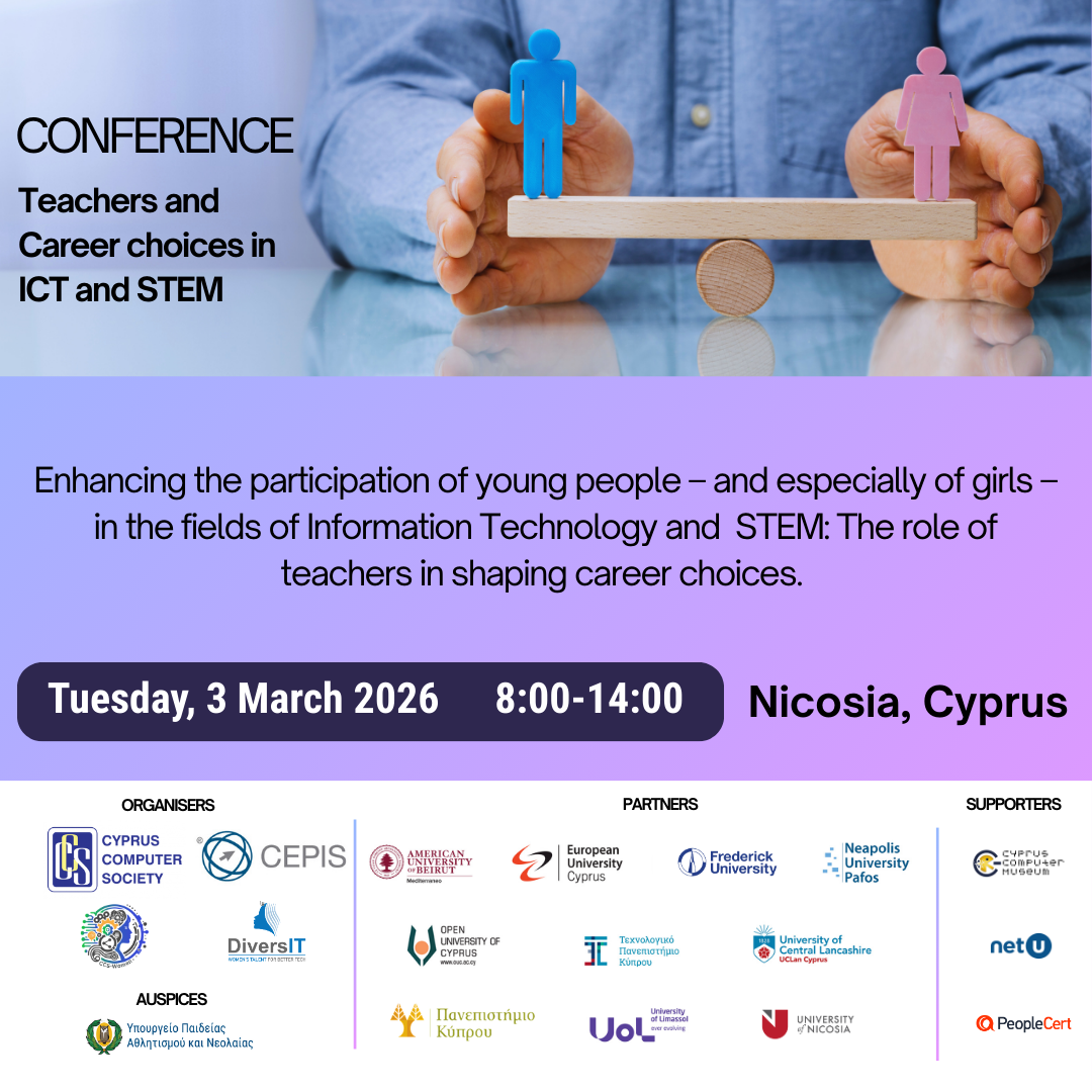 The Cyprus Computer Society (CCS) and the Council of European Professional Informatics Societies (CEPIS), in cooperation with ten (10) public and private universities in Cyprus, and under the auspices of the Cyprus Ministry of Education, Sports and Youth, are organizing a conference with the subject Strengthening Career Guidance especially those of girls in the fields of Information Technology and STEM.